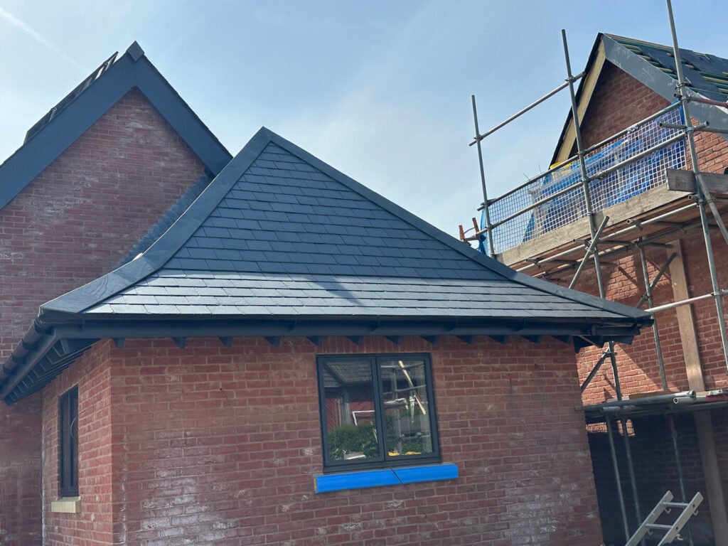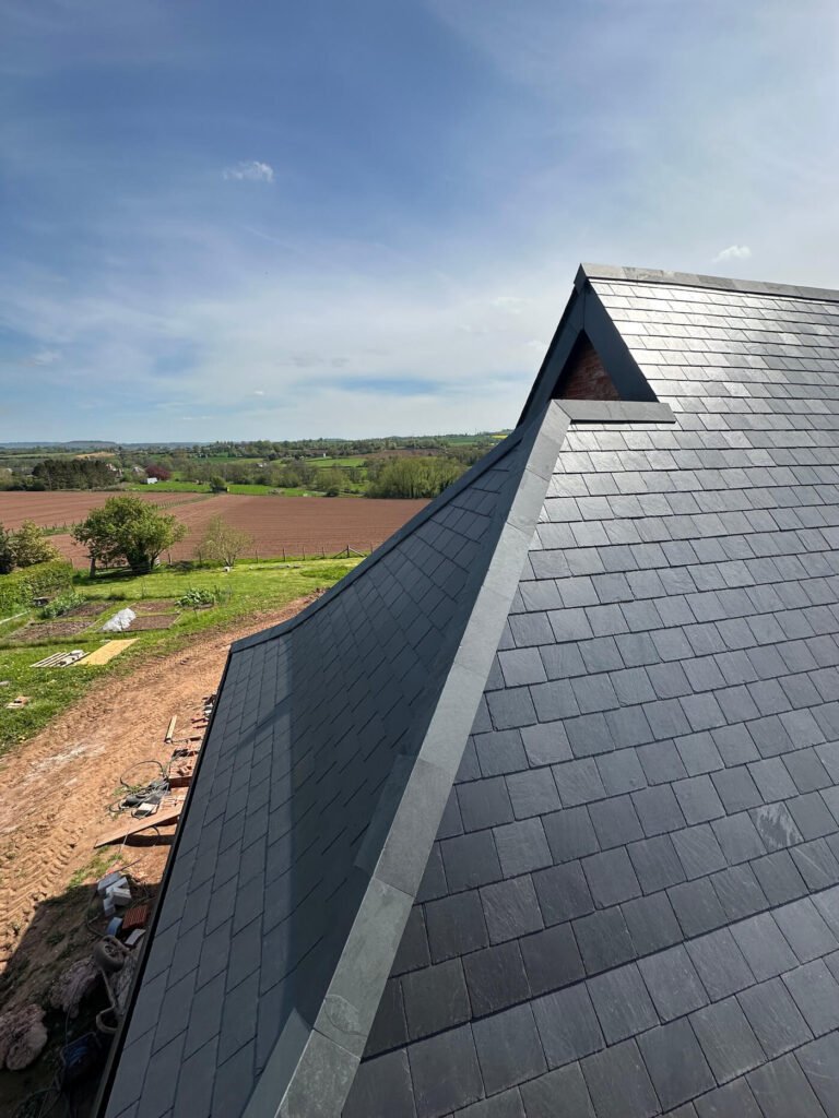 The natural slate ridge was ordered with a variety of preformed angles to fit the complex roof design perfectly, with block ends and hip ends to add the finishing touch.