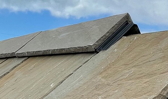 Our vented ridge is also available in natural stone. RealRidge stone makes installing the ridge on traditional stone roofs easy, ventilated and dry fix. Our pre-formed stone ridge tiles are available in a variety of stock angles and can be coloured on request.